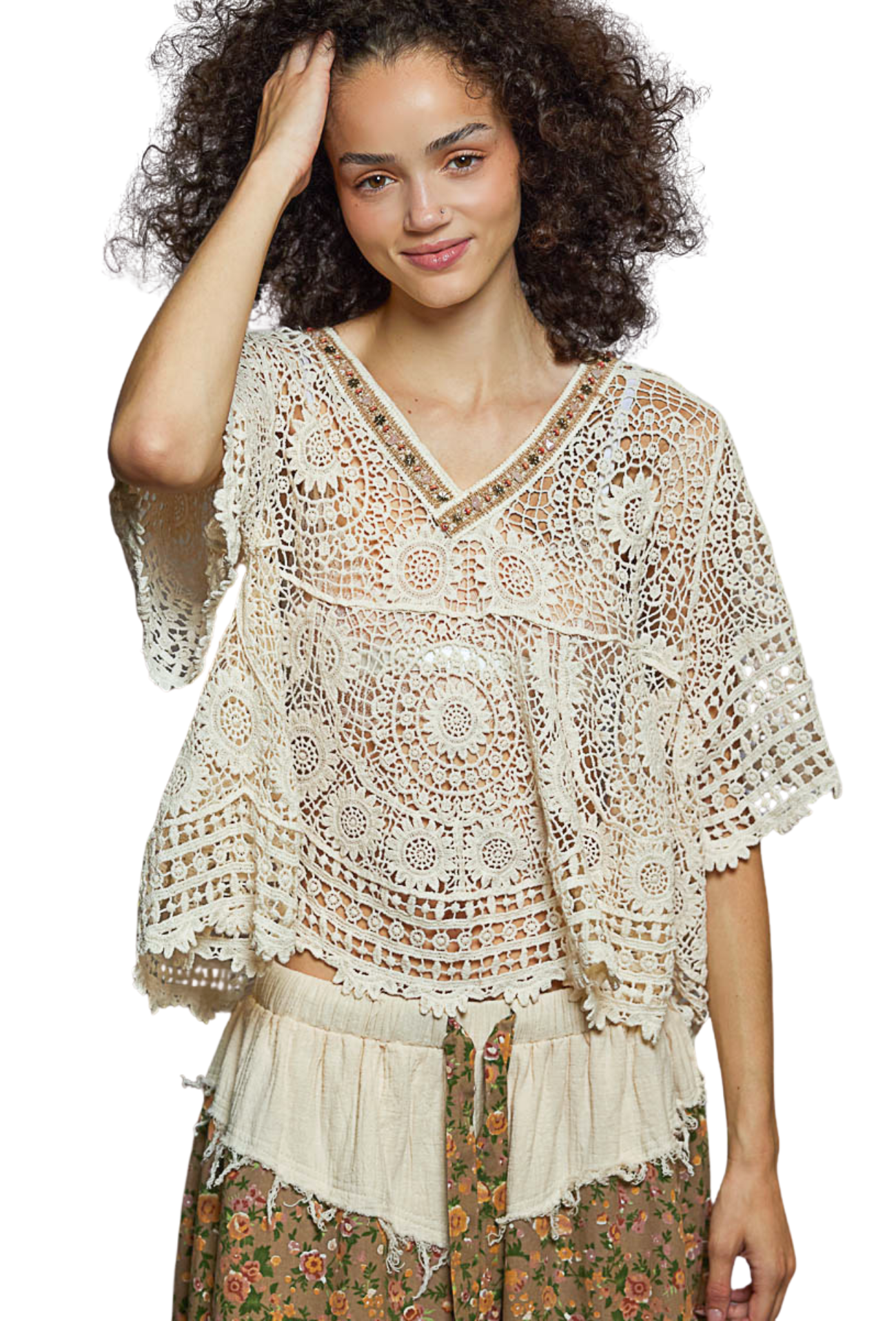 Elevate your wardrobe with this stunning crochet top, a boho essential that effortlessly transitions from day to night. The delicate V-neck design flatters every frame while the intricate crochet detailing adds texture and visual interest. Perfect for layering over your favorite basics or wearing solo, this versatile piece brings an artisanal touch to any outfit. Embrace relaxed, bohemian style without compromising on sophistication—a must-have for anyone who loves handcrafted charm and timeless appeal.