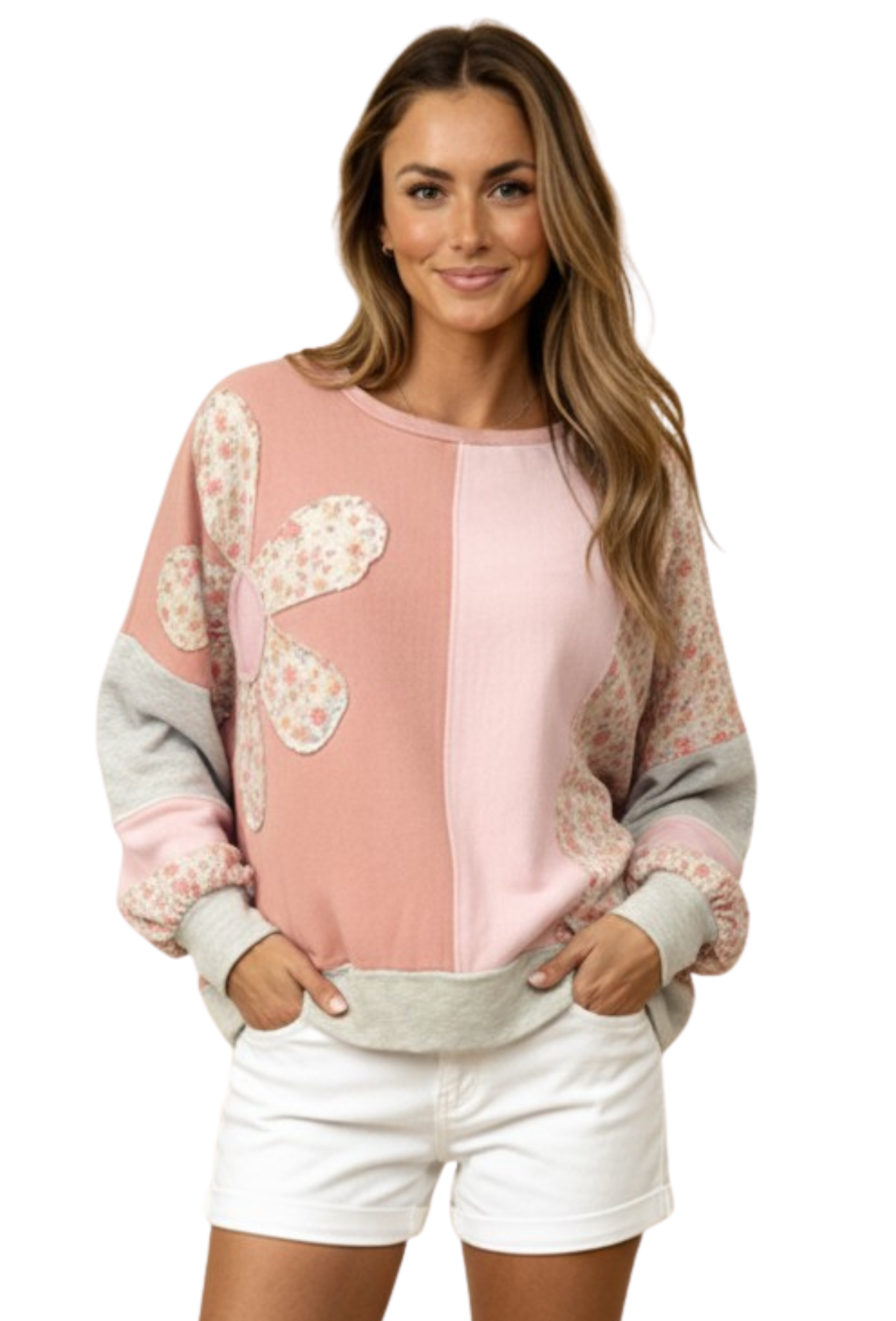Elevate your everyday wardrobe with the Think Happy Thoughts Top, a versatile pullover that combines comfort with contemporary style. This charming piece features a round neckline and long sleeves in a soft, textured knit that feels as good as it looks. The color-block design pairs beautifully with delicate floral prints and woven flower patches, creating visual interest that transitions seamlessly from casual days to weekend outings. The bubble sleeve detail adds a playful touch that flatters various body types, while the quality construction ensures lasting wear. Perfect for layering or wearing solo, this top brings effortless sophistication to your closet.
