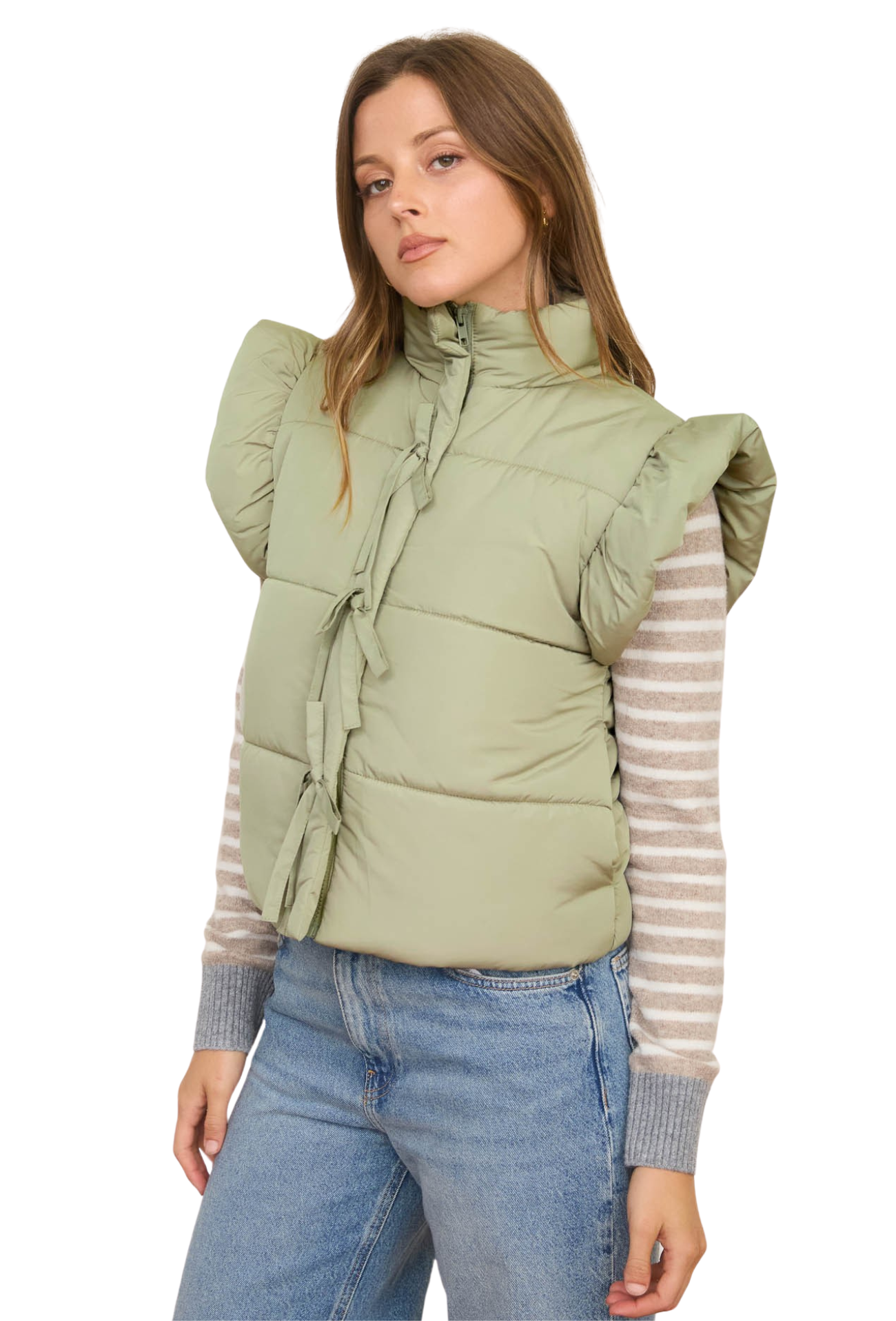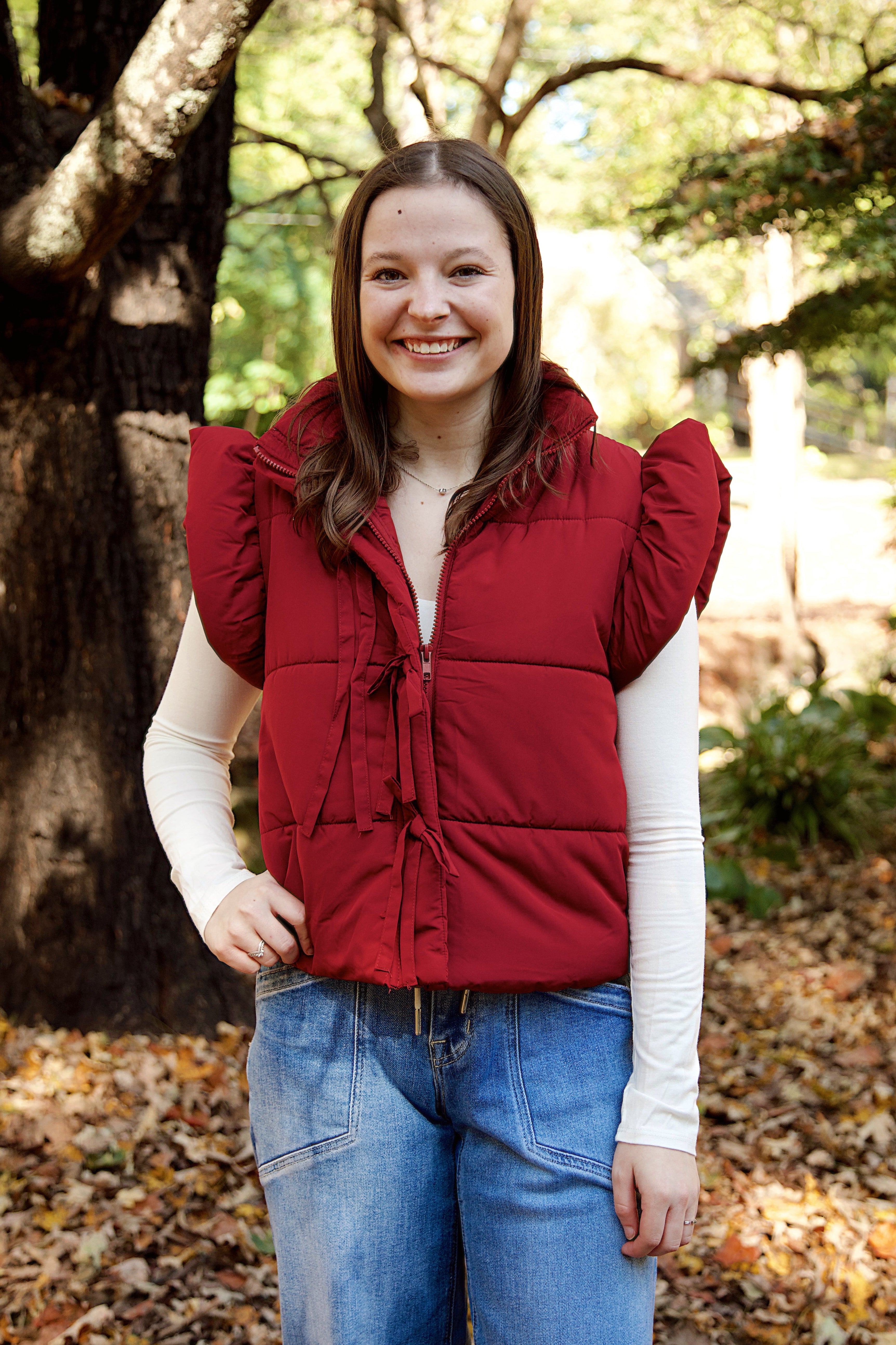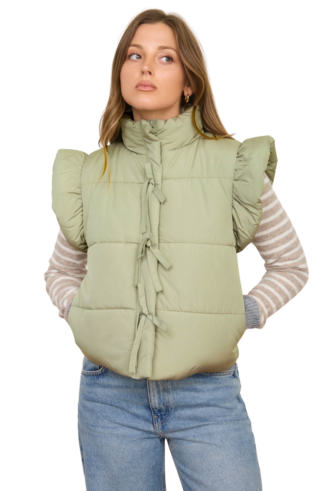 Stay cozy this fall with the Next Thing You Know Puffer Vest, designed to keep you warm without sacrificing style. Featuring charming bows on the front, this vest adds a feminine touch to your layering essentials. Its lightweight insulation provides just the right amount of warmth for crisp autumn days, making it a perfect choice for outdoor walks or casual outings. Embrace the season confidently and comfortably with this versatile, must-have piece.