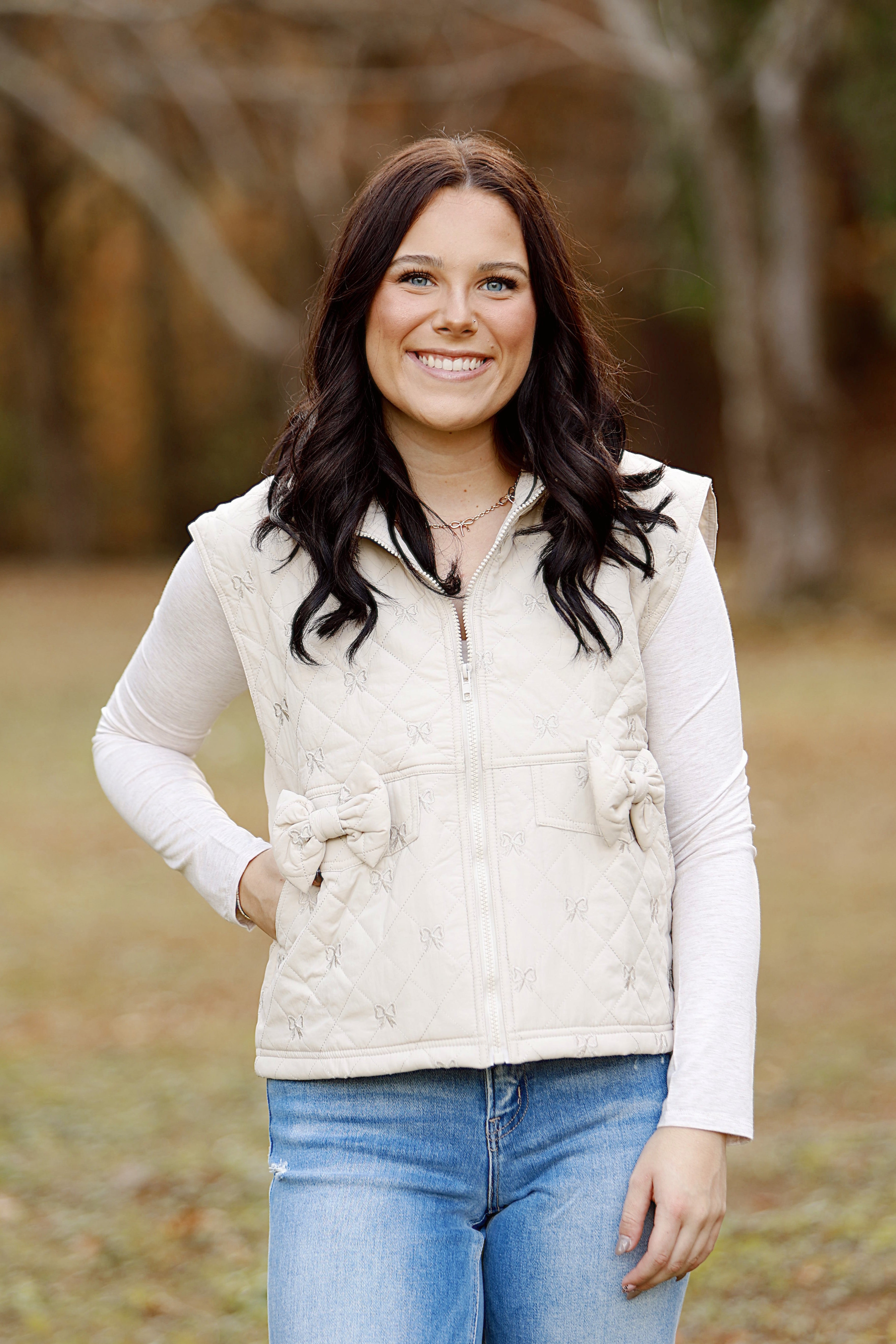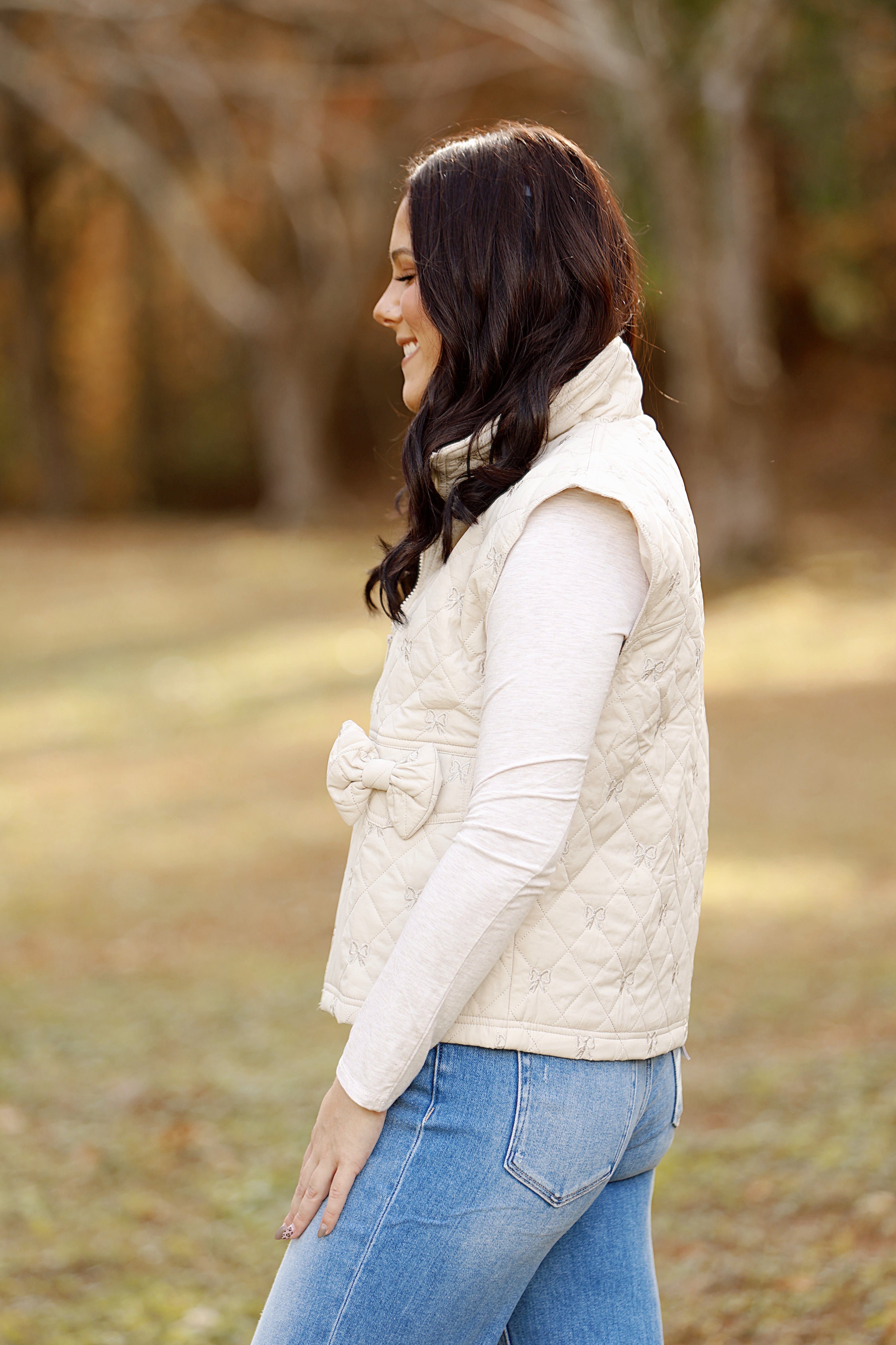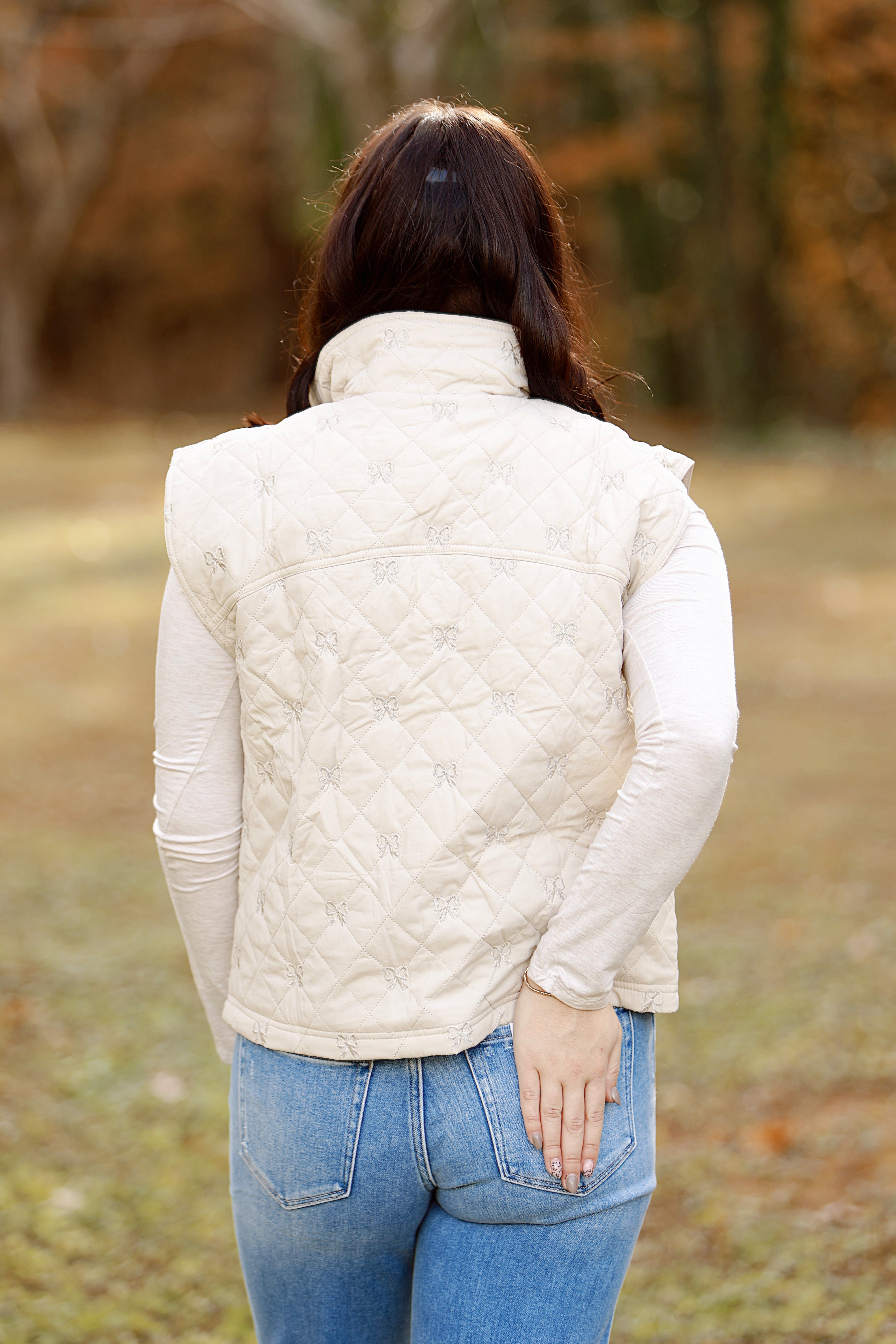 Elevate your winter wardrobe with this enchanting vest, where delicate bow embroidery adds a touch of whimsy to timeless style. Perfect for layering over your favorite sweaters and long-sleeves, it creates effortless dimension while keeping you cozy through the season. The thoughtful design transitions seamlessly from casual days to special occasions, making it the versatile piece you've been dreaming of. Wrap yourself in sophistication and charm.
