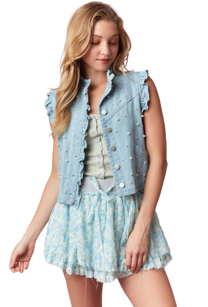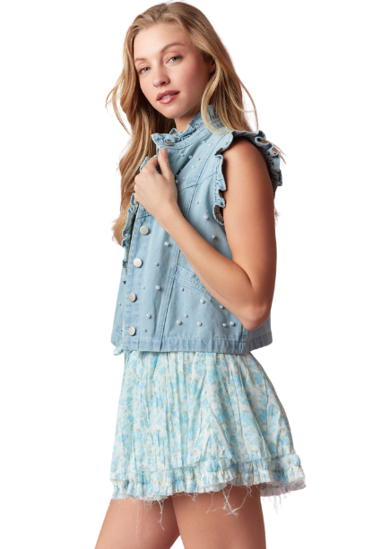 Elevate your casual look with the You Know Me Cropped Denim Vest, featuring a stylish button closure for easy wear. Delicate pearl details add a touch of elegance, while playful ruffles bring feminine flair to this versatile piece. Perfect for layering, this vest combines classic denim with chic accents to make your outfit stand out effortlessly.