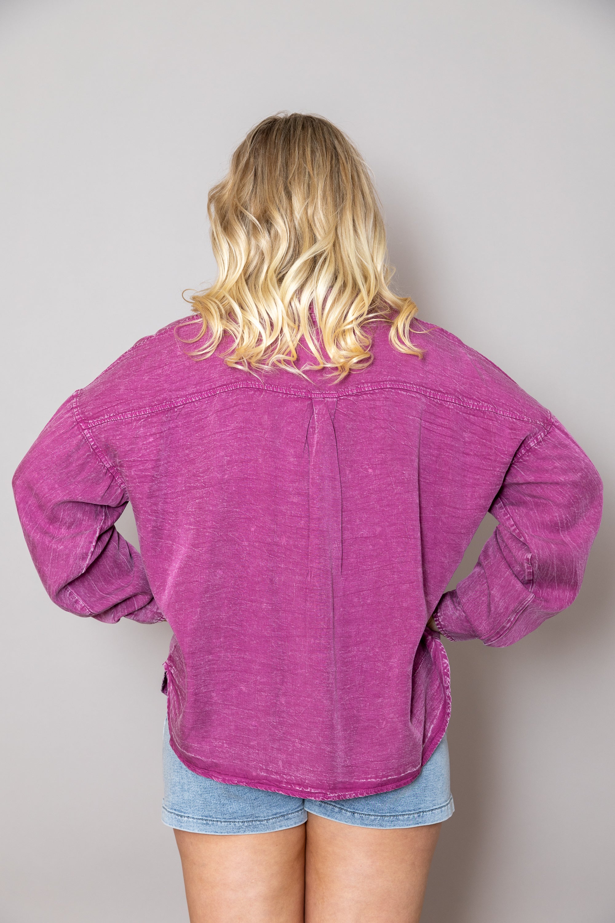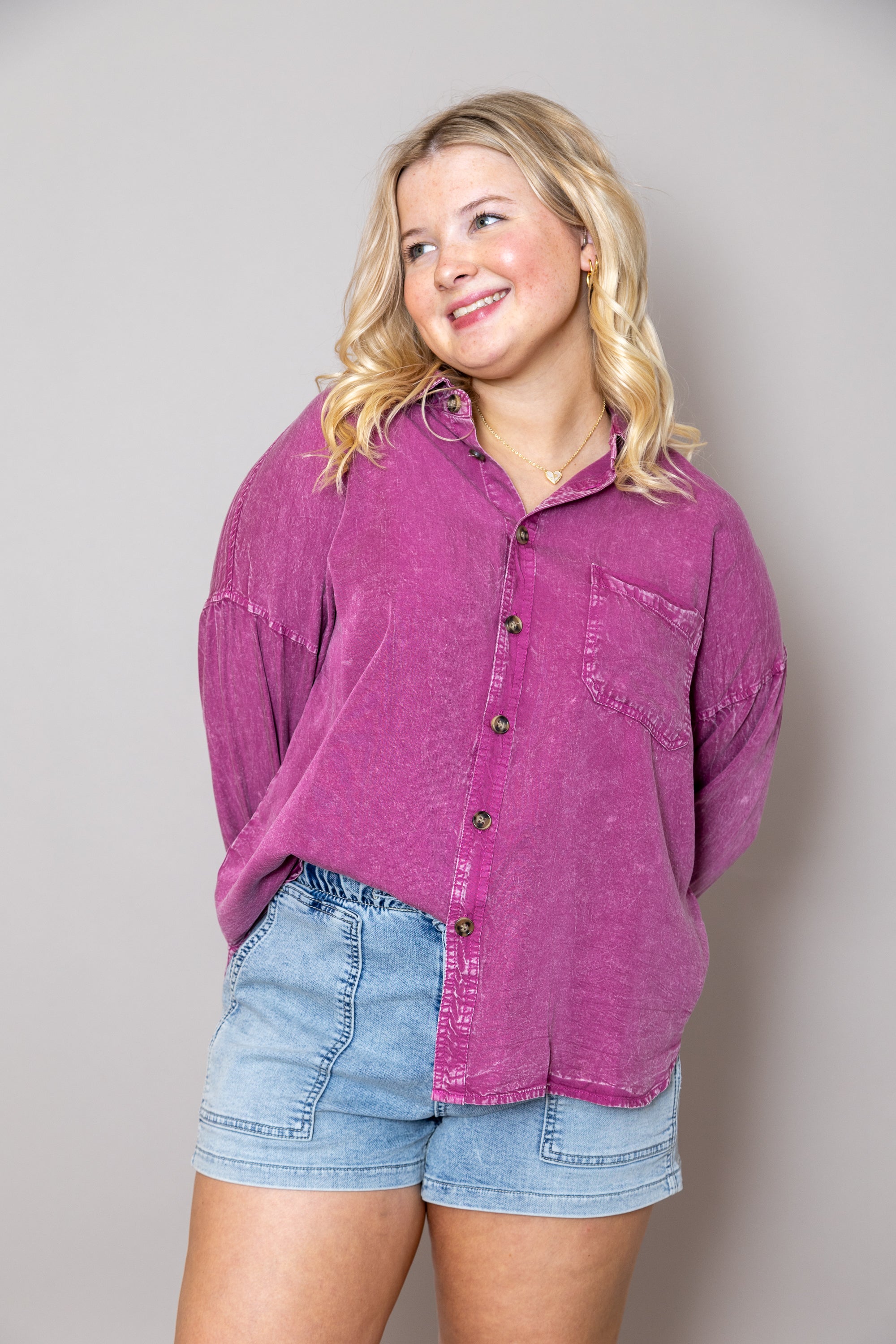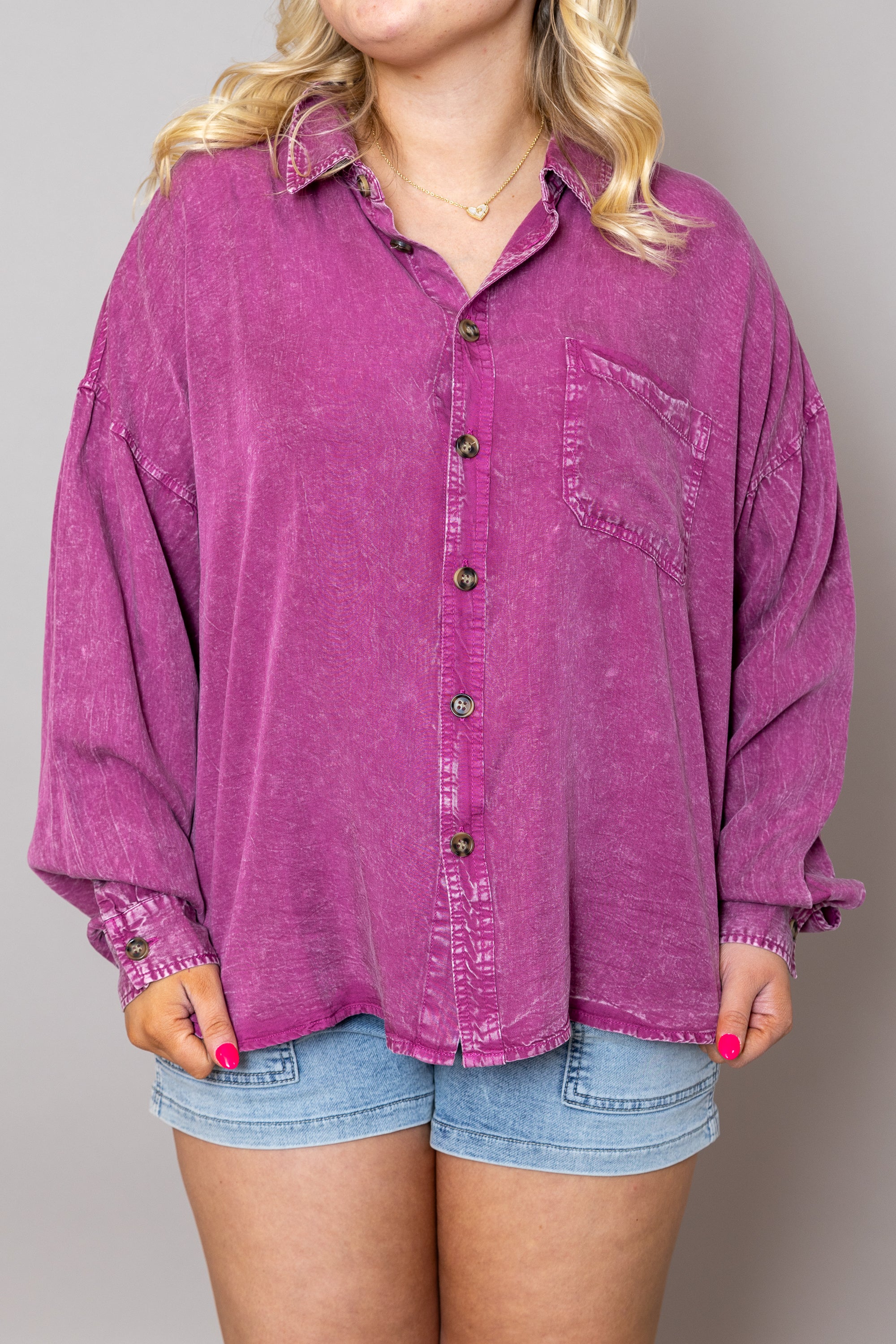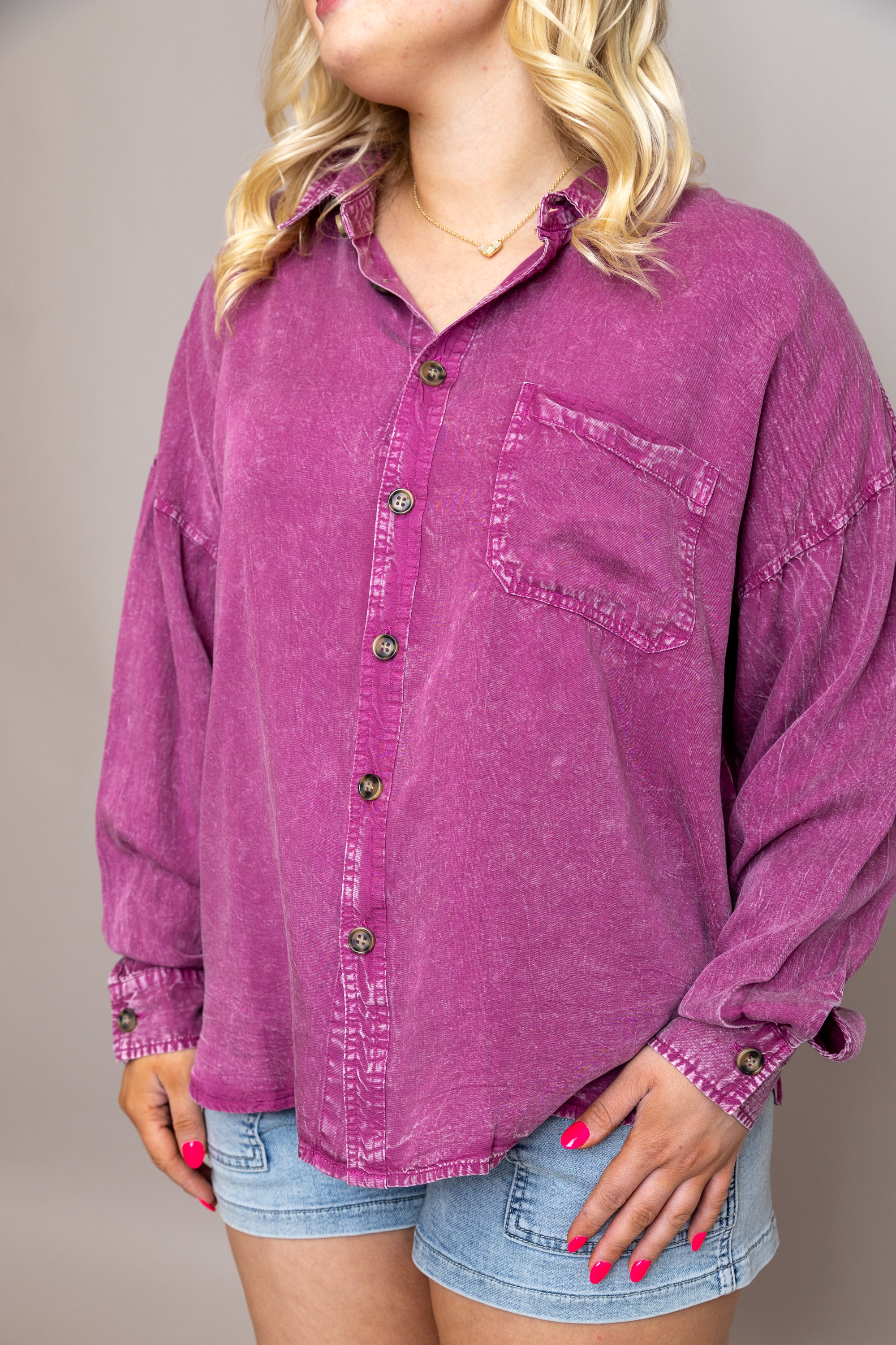 Waiting For You Button Down Top - Magenta / Medium is backordered and will ship as soon as it is back in stock.