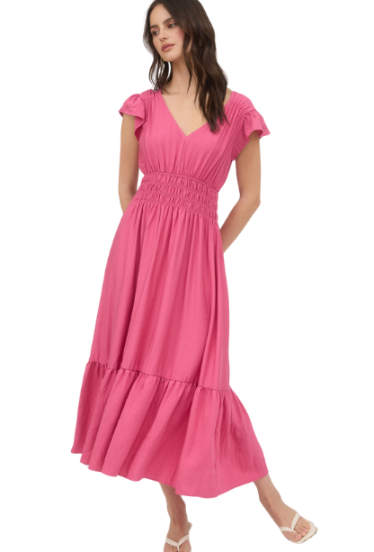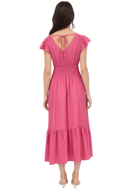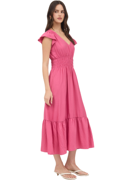 This enchanting midi dress features delicate frilly sleeves and a flattering v-neck that accentuates your neckline. The flowy silhouette drapes beautifully over your curves, creating an effortlessly romantic look that's perfect for special occasions or date nights. You'll love how this dress moves with you, making you feel as beautiful as you look.